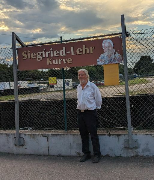 Als Höhepunkt des Abends wurde Siegfried Lehr für über 55 Jahre im Amt als 1. Vorstand mit der Einweihung der Siegfried-Lehr-Kurve geehrt. Die Mitglieder und Gäste fanden sich im Bereich der Zufahrt im Innengelände ein. Unser Mitglied Martin Oelschläger war extra mit seinem Lotus angereist und fuhr mit Sigi eine Ehrenrunde bis zu der Kurve die dann eingeweiht wurde. Patric Kühn übernahm die Einweihungs-Rede, informierte die Mitglieder und Gäste über das jahr-zehntelange ehrenamtliche Engagement von Sigi und enthüllte dann das Schild „Siegfried-Lehr-Kurve“ und die Ehrentafel für Sigi. Unser 1. Vorstand hat sich darüber sehr gefreut, war sichtlich ergriffen und bedankte sich recht herzlich.
