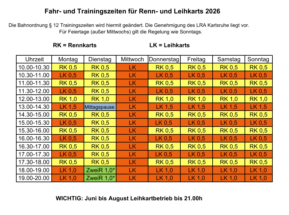 Fahr-und Trainingszeiten für Renn-und Leihkart